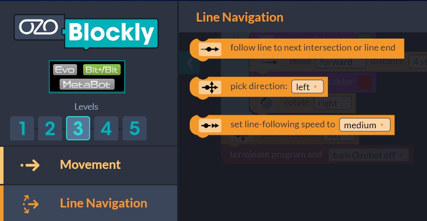 A lenti ozoblokly linkre kattintva a blokkszerkesztőbe jutsz. A Sokoban pályákhoz szükséges utasítások a 3. szint bekapcsolása után érhető el, (Line Navigation fülön). Valamint a Bit+/Bit-re is állítsd át, mert nekünk ilyen OZOBOT-unk van!