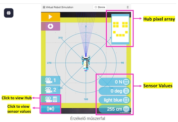 A Virtuális Robot Szimuláció beépített érzékelő irányítópulttal rendelkezik, amely lehetővé teszi a diákok és a tanárok számára, hogy gyorsan ellenőrizzék a robot által látott értékeket, felgyorsítva a kód fejlesztésének és hibaelhárításának folyamatát. Chrome böngészőben nyisd meg.! Jobb gomb a legjobb barátod, kérd meg, hogy fordítsa le az oldalt magyarra, vagy dolgozz angolul!